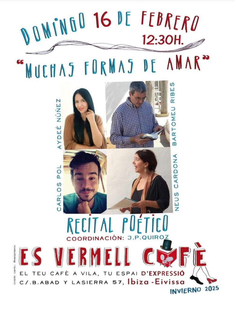 Bajo el título Muchas formas de amar, reunimos a cuatro poetas de la isla: Aydeé Núñez, Neus Cardona, Bartomeu Ribes y Carlos Pol. Cuatro voces distintas, pero todas cercanas y honestas. Cada uno aportó su mirada sobre el amor, no solo el romántico, sino también el que se expresa en la amistad, la pérdida, la familia o incluso en la contemplación del paisaje o en la memoria.